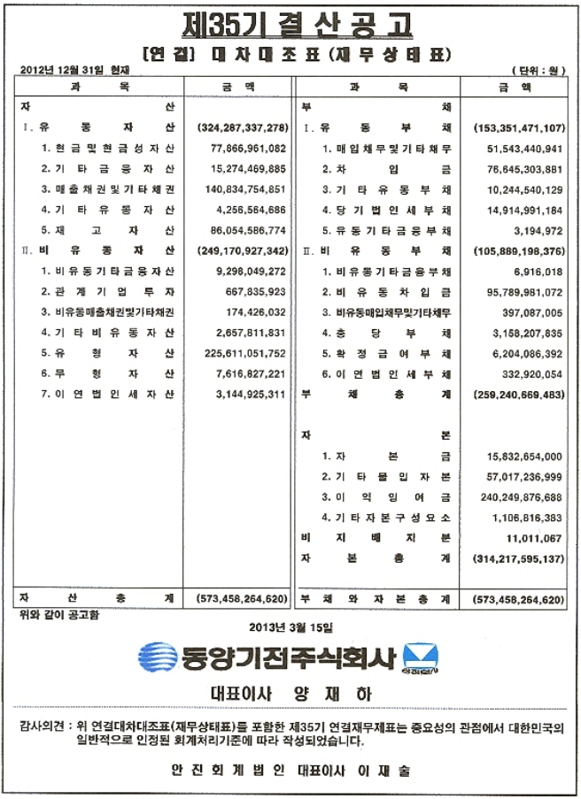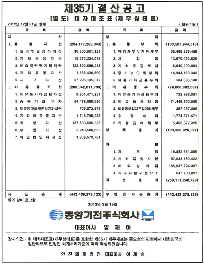 제35기 대차대조표(별도 및 연결) 공고