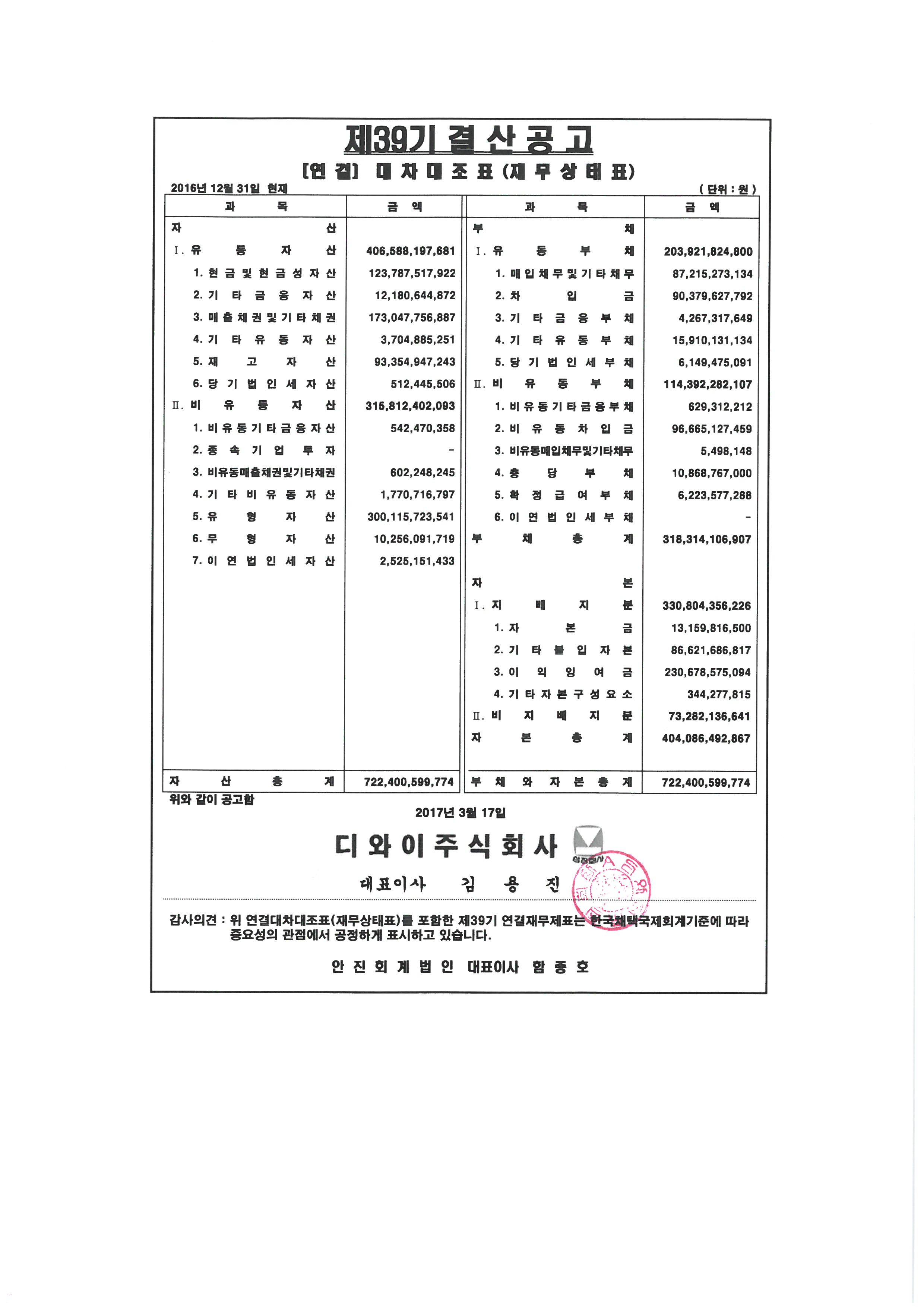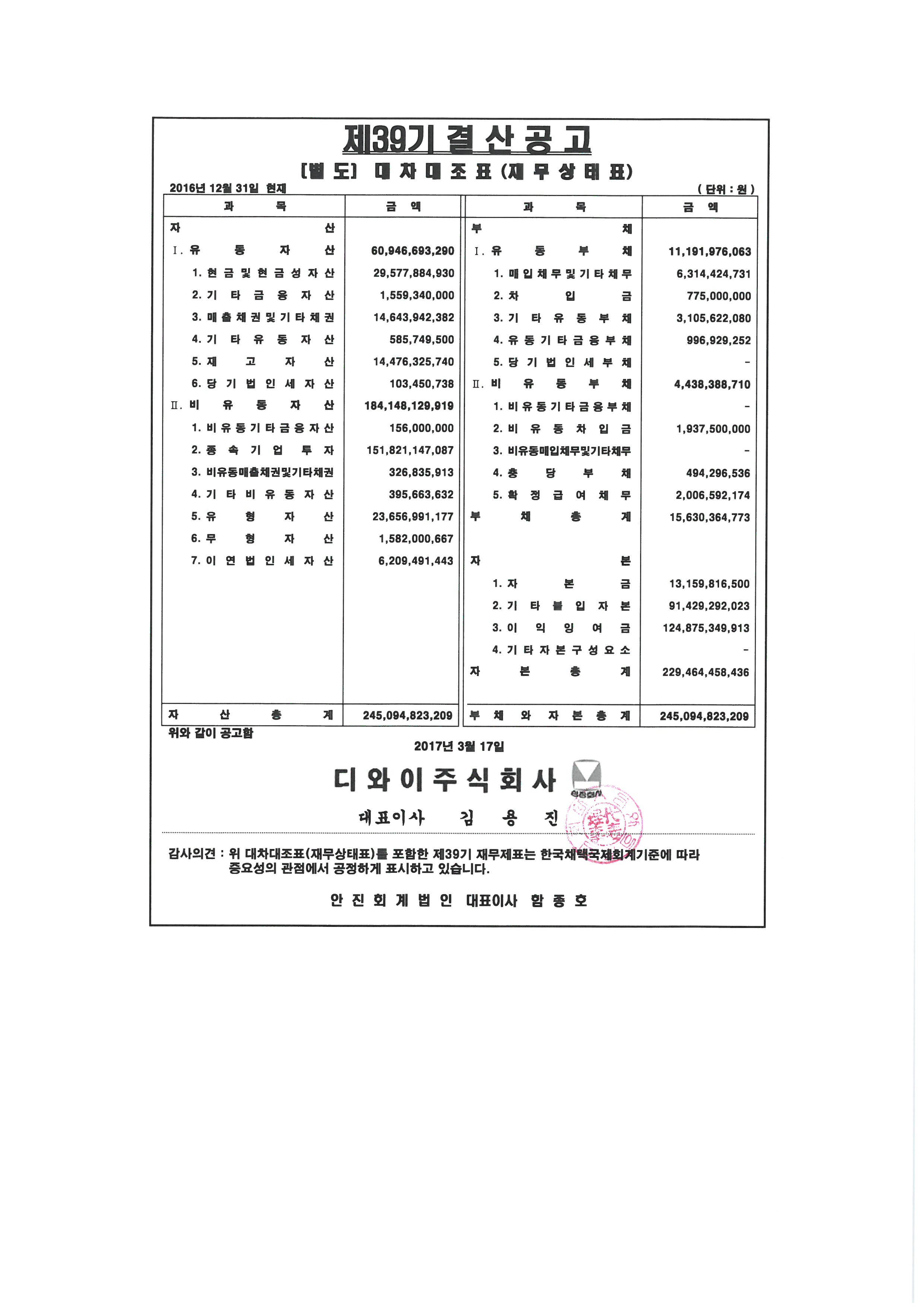 제39기 대차대조표(별도 및 연결) 공고