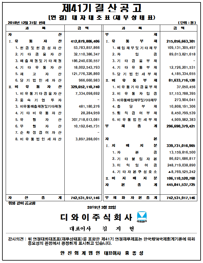 제41기 대차대조표(별도 및 연결) 공고