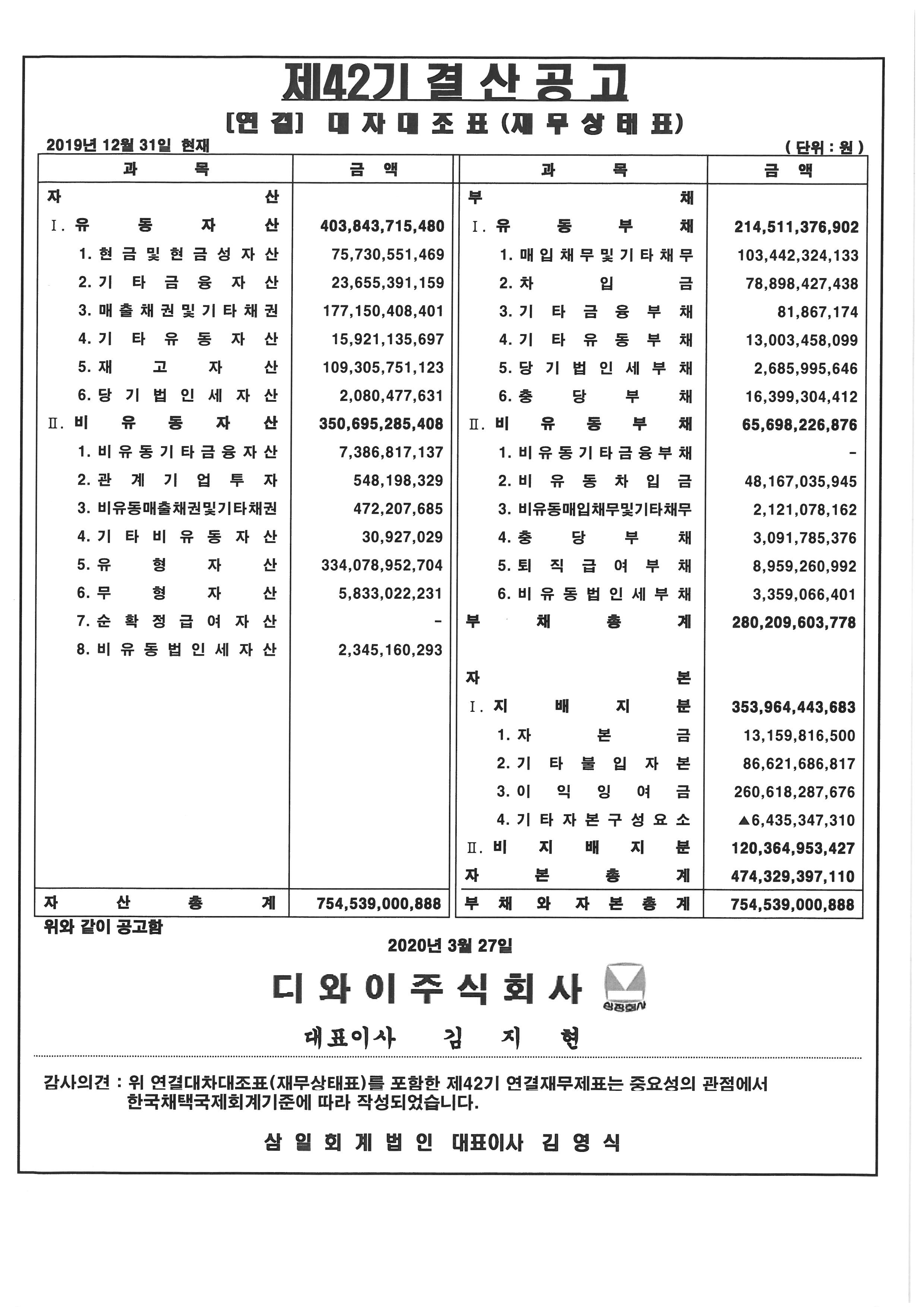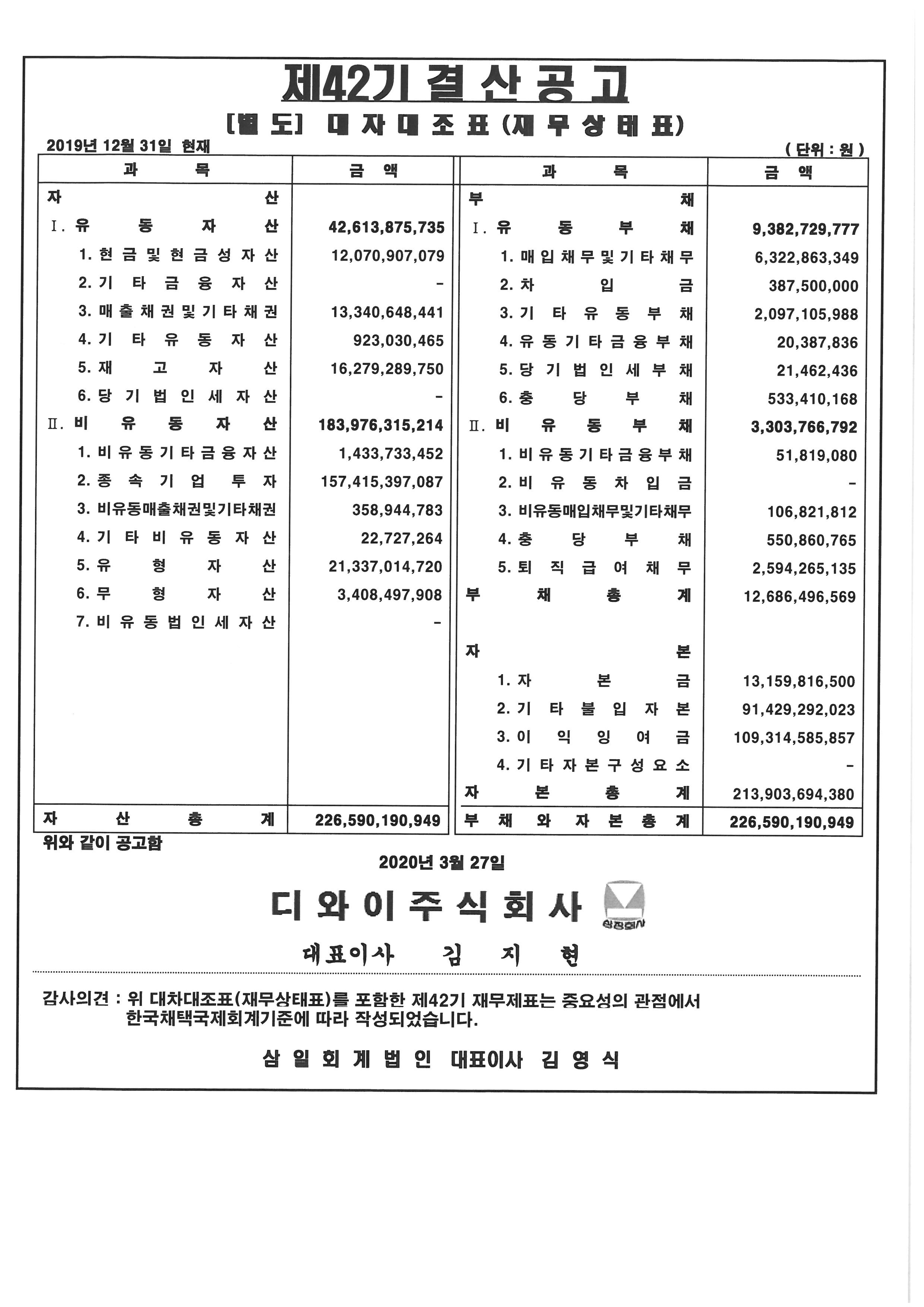 제42기 대차대조표(별도 및 연결) 공고