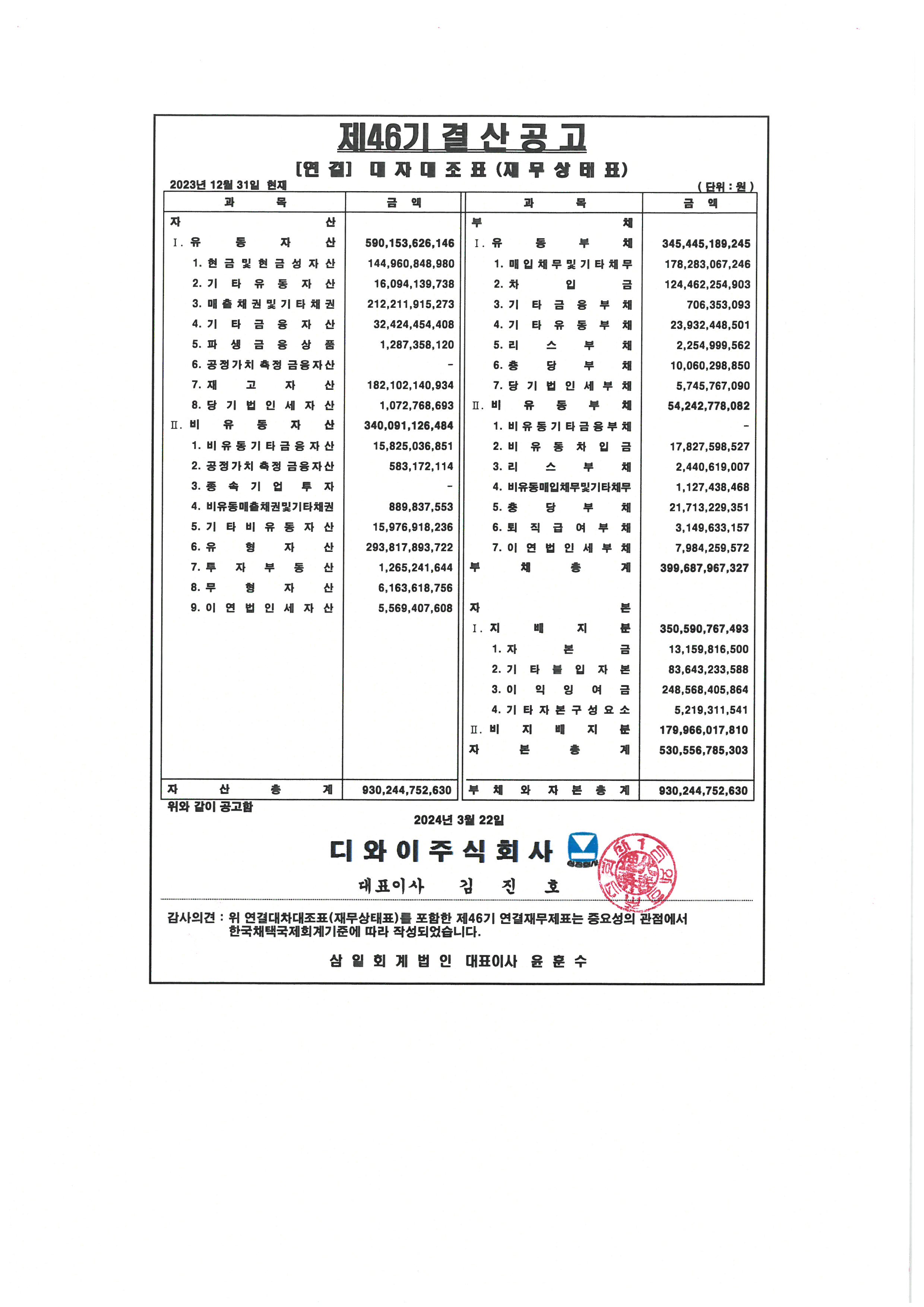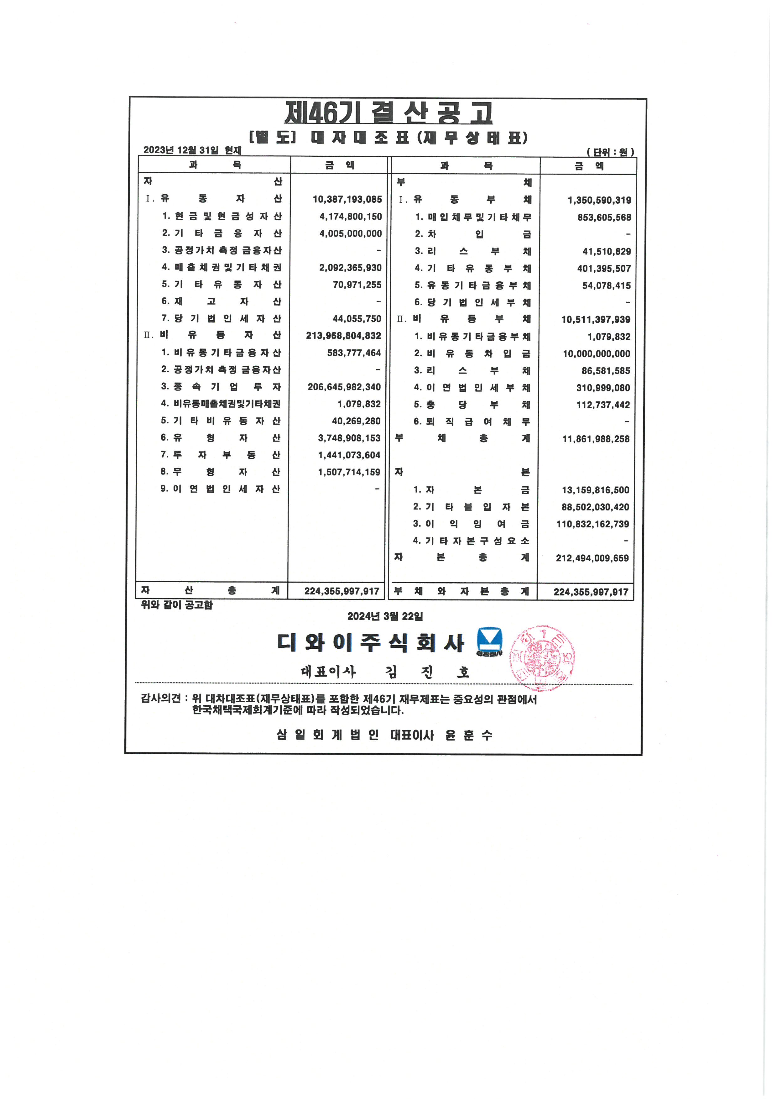 제46기 대차대조표(별도 및 연결) 공고